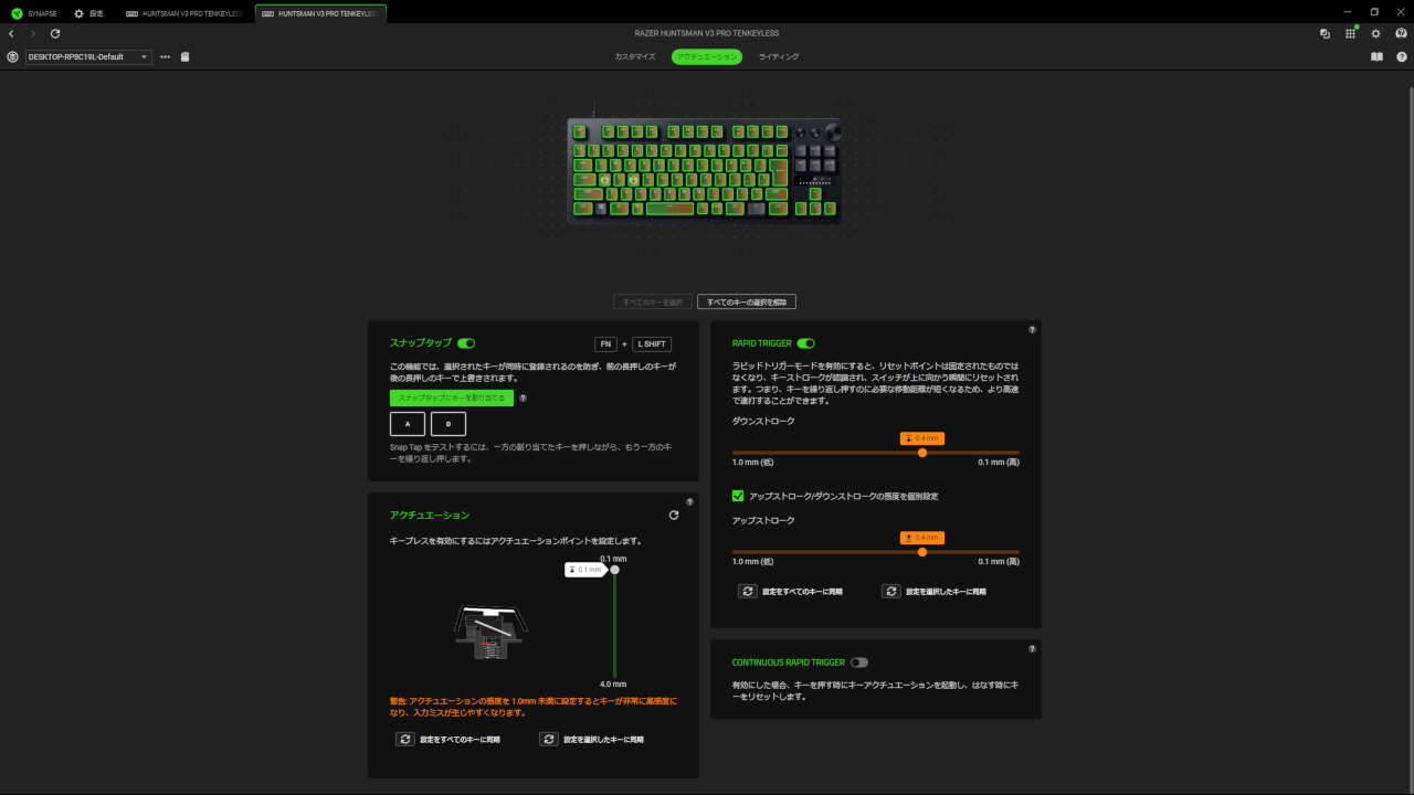 ココだけ聞くと完璧な機能に感じますが、やはりデメリットもあります。ラピッドトリガーを使った人なら分かるかと思いますが、ラピッドトリガーの感度を短く設定しておくとちょっとした指の動きでキーの入力が切り替わってしまい、動きが止まってしまうということがちょくちょくありました。感度を長くすることでこのような症状はある程度回避できますが、長くすれば結局ラピッドトリガーの効果は薄まるので、ある程度妥協しなければならない部分は出てきます。とは言えデメリット以上にメリットが大きいので、個人的には使わない理由にはならない印象です。
