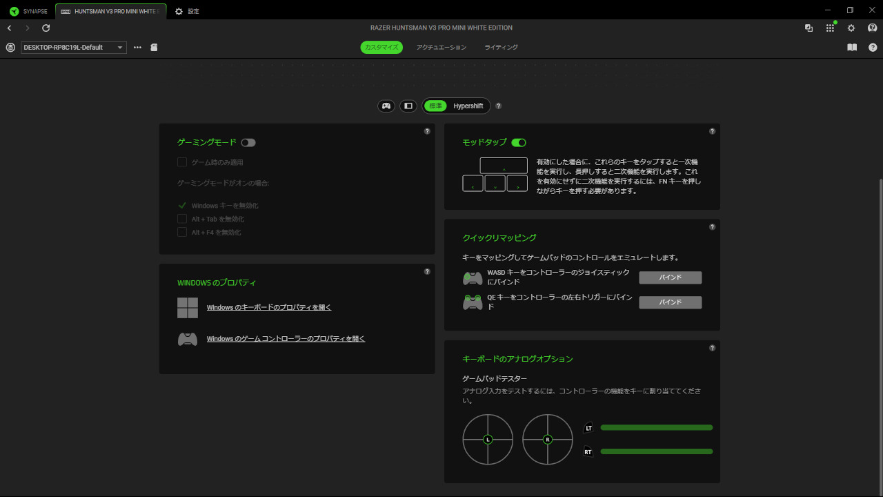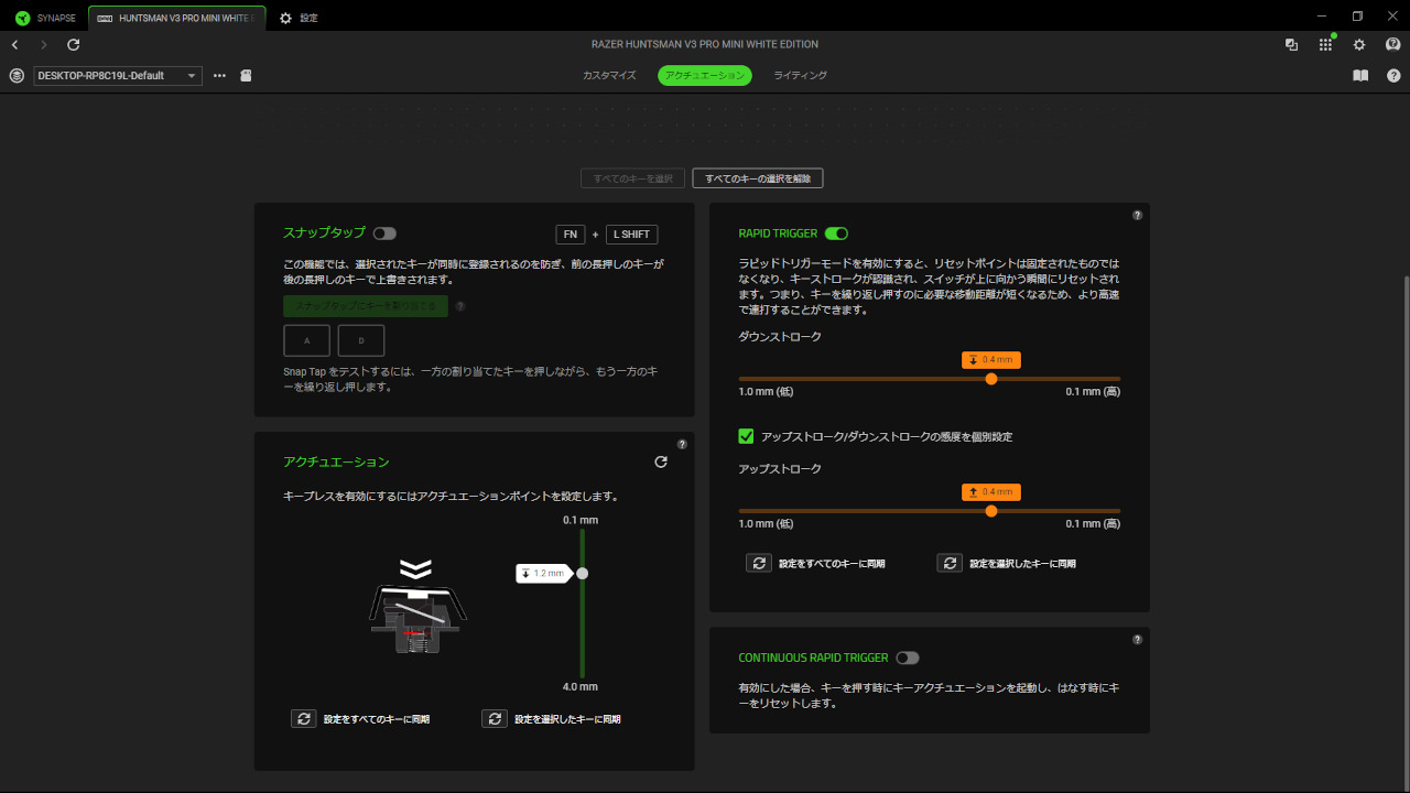 ただ「Huntsman V3 Pro Mini」では指を置くだけで反応するくらい高感度なため、実際に使うにはAP少し高めに設定する必要があると思います。対して「TAC75 HE」は指を置いたくらいでは反応しないため、その点を考慮すると結局は同じかなと思います。