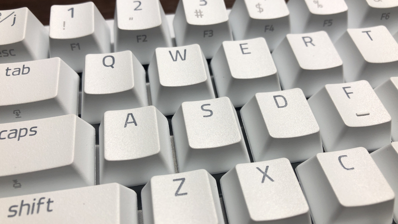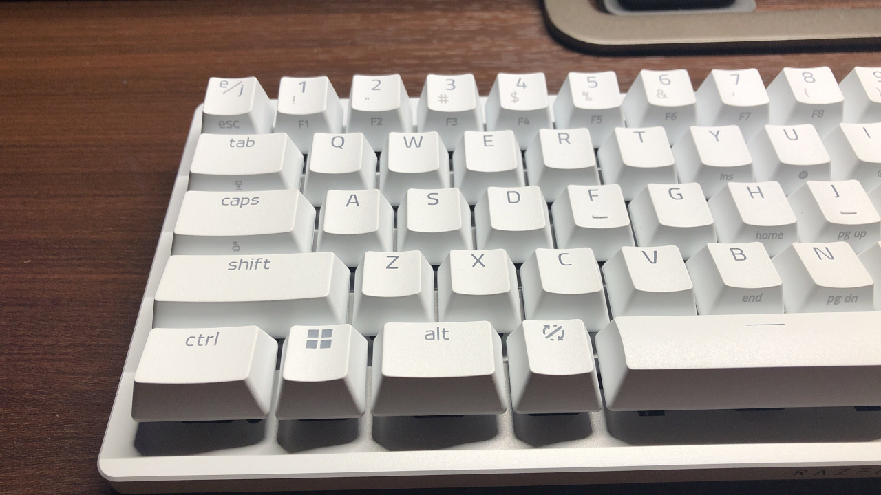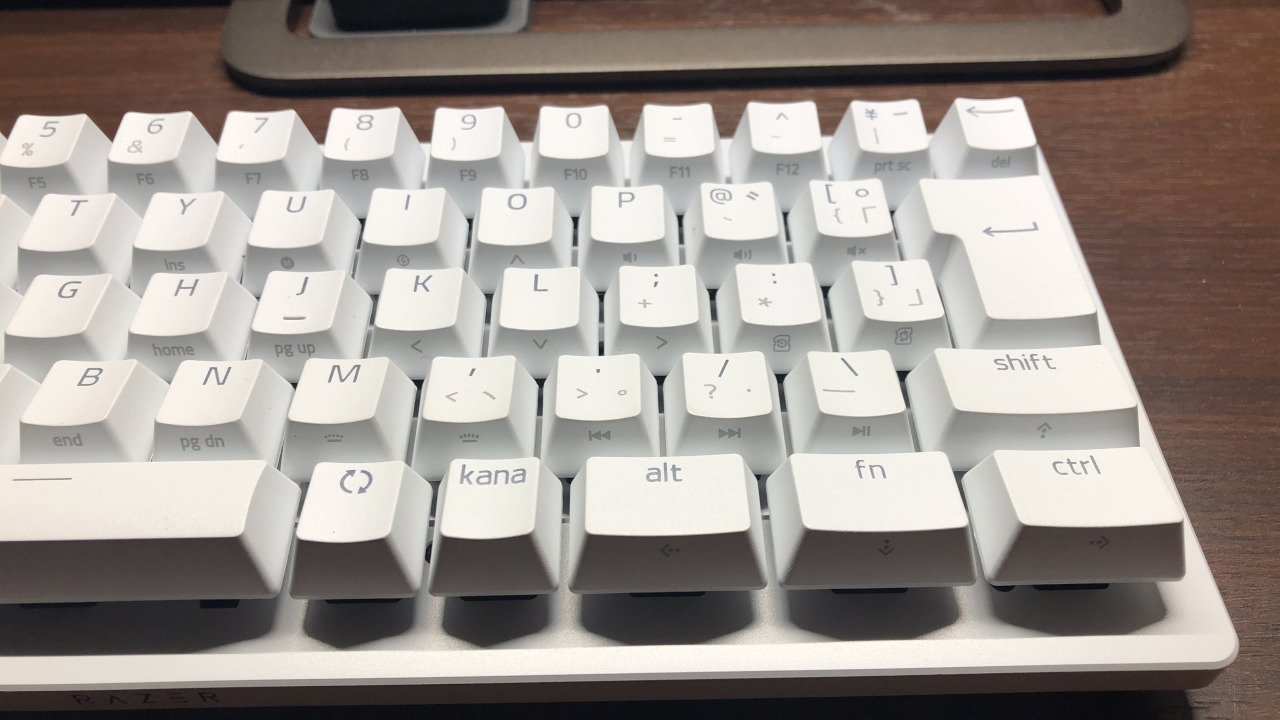 PBT製のキーキャップで若干指が滑りやすい質感をしています。滑りやすいので素早く指を移動させることが出来ますが、指を決まったキーに置いておきたいという時は安定しない印象です。
