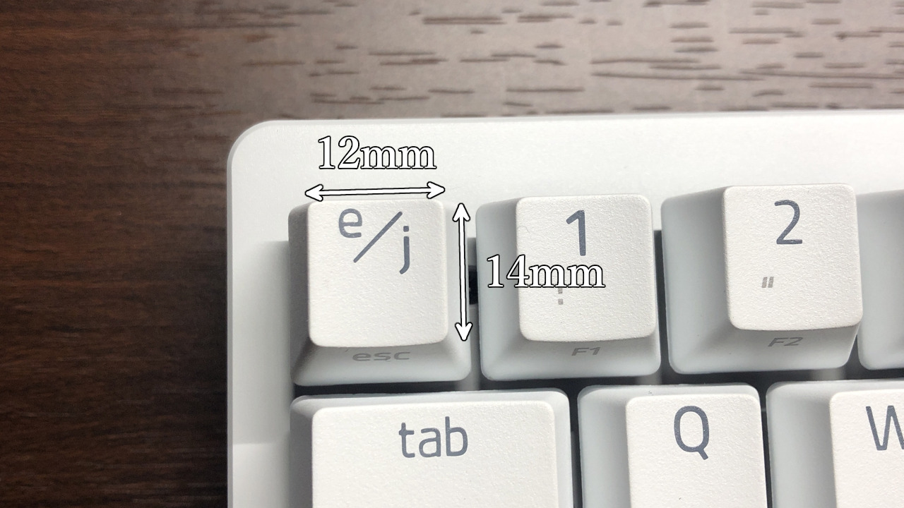 キーキャップの形状はスペースキー以外は凹状、スペースキーは凸状になっています。サイズは横幅が約12mm、縦幅が約14mmで標準的サイズ。